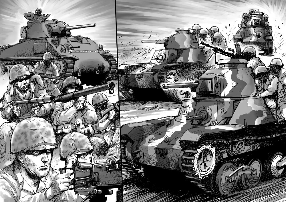2022年08月04日 夏は暑いです 引き続きお仕事中であります。7月、8月は例年、本業も忙しいのであります。なにしろご先祖を偲ぶ月でして、はあ。今回の絵は以前イカロス出版のミリタリークラシックスで描かせていただいたもので、ペリリューの戦いの挿絵。米海兵隊vs九五式軽戦車之図 「日記」カテゴリの最新記事 < 前の記事次の記事 > コメント コメントフォーム 名前 コメント 記事の評価 リセット リセット 顔 星 情報を記憶 コメントを投稿する
